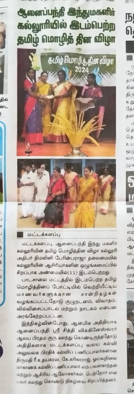 Our school Tamil Day celebration was held on 11.04,2024 with the head of our principal Mrs.N.Perinparaja.Mrs.T.Uthayakaran(DDE -Development),Mr.K.Harihararaj(DDE-Admin),Mr.M.Pavalakanthan(Retired Provincial Director of Education)were the guests for the events.